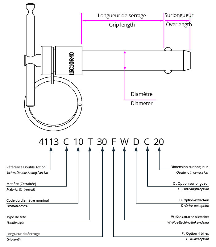 Pin can be removed or installed if unlocked by pushing the button or the extended spindle (optional), or by pulling the ring